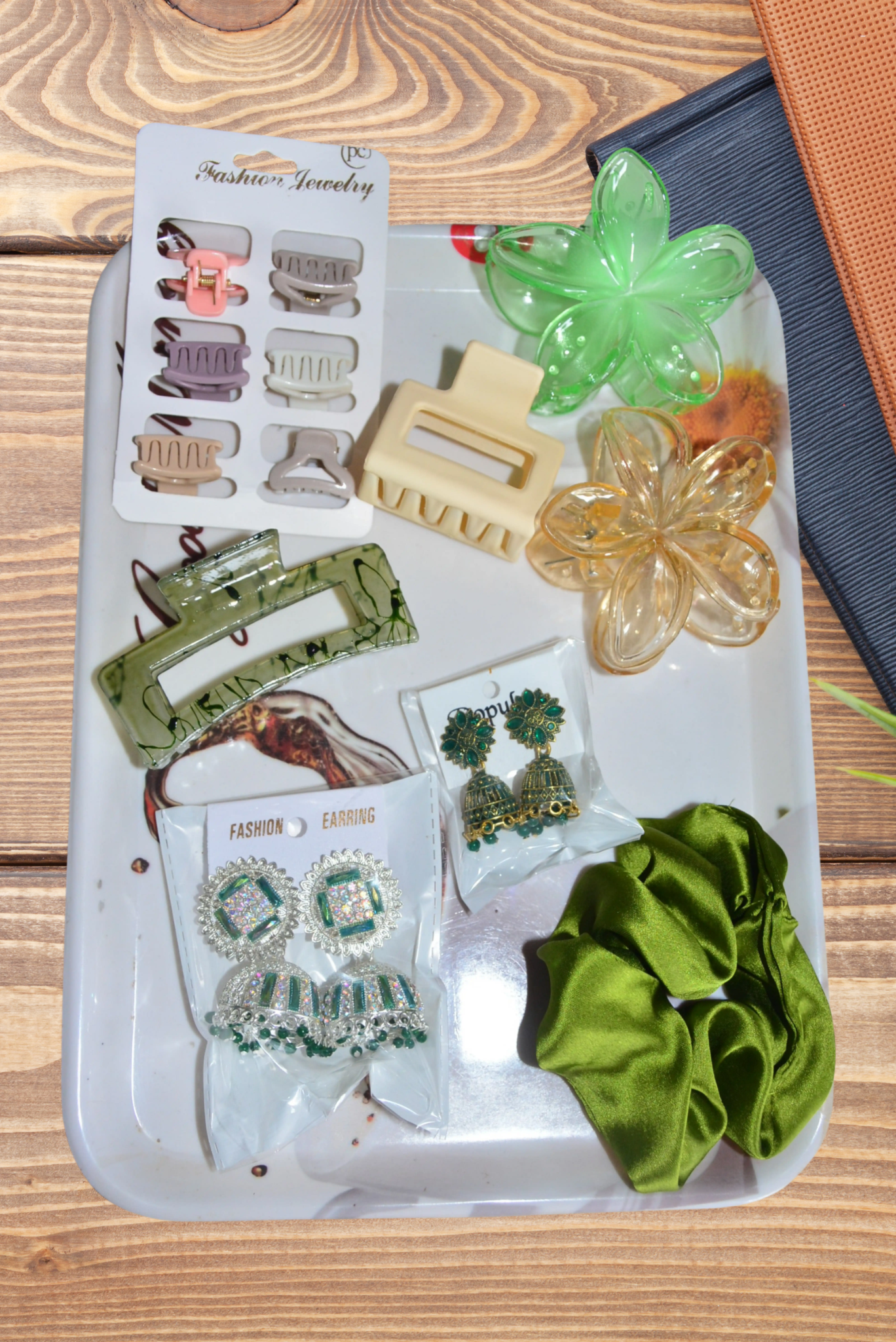 Upgrade your style with this Trendy Hair Accessories & Earrings Combo Set, specially curated for women who love fashion and elegance. This premium combo includes a variety of durable hair claw clips (large, medium & mini sizes), a soft satin scrunchie, and two pairs of stylish earrings.
